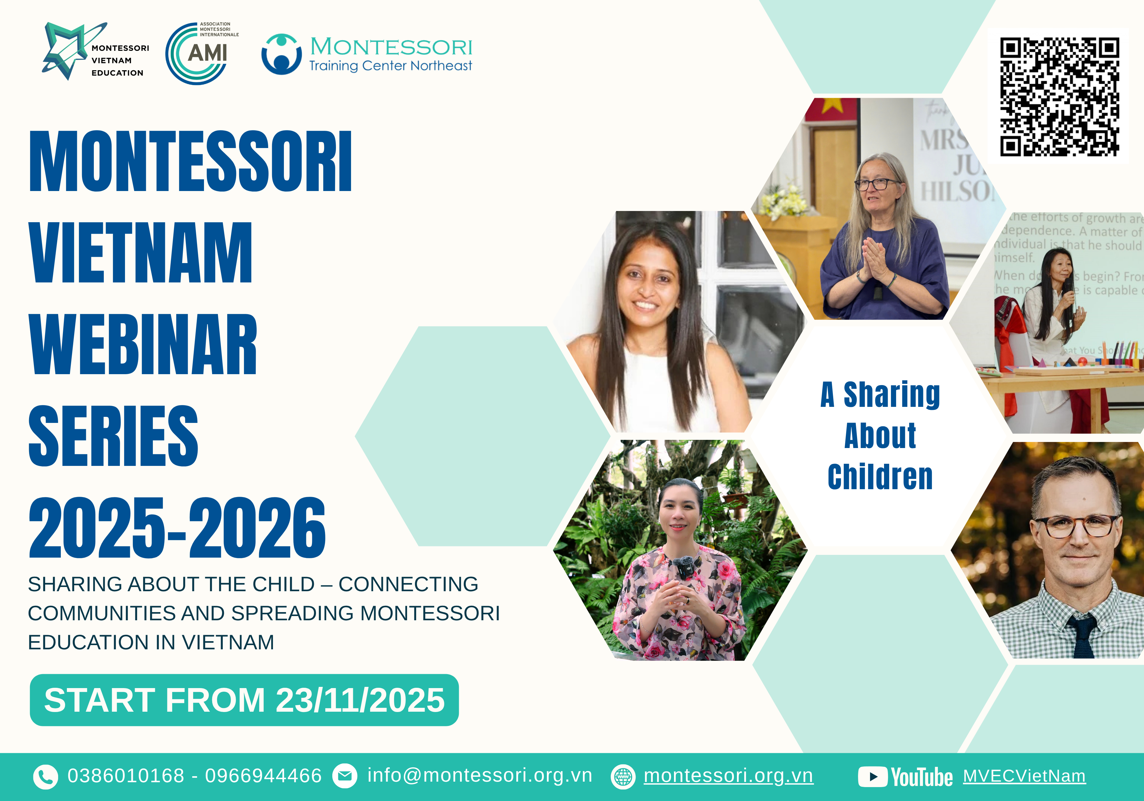 The series “A Sharing About Children” will be organized throughout the 2025–2026 school year by MVEC, in collaboration with international Montessori trainers and experts from AMI – MTCNE, along with Vietnamese educators. The program aims to create a space for connection – sharing – and growth for those who care deeply about early childhood education through the philosophy of Dr. Maria Montessori.